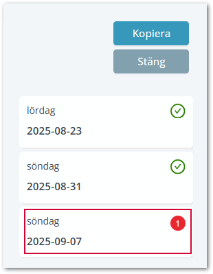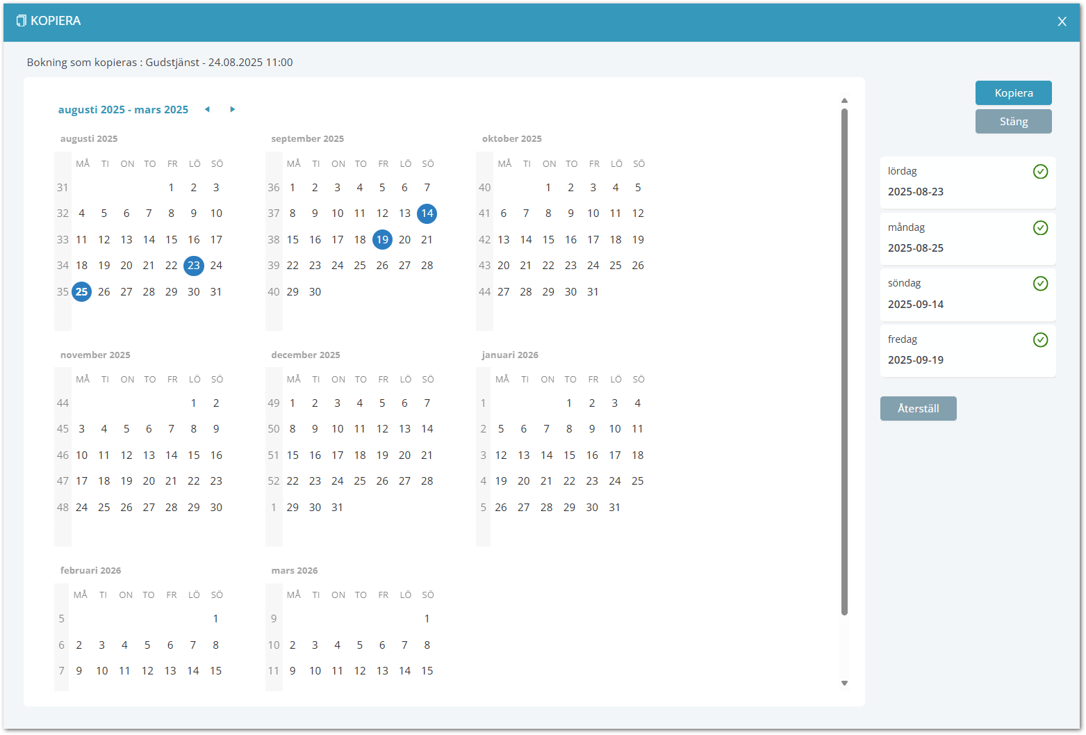 Alla resurser som fanns på originalbokningen blir kopierade till de valda datumen. Funktionen är utmärkt till bokningar som inte ligger exakt varje eller varannan vecka utan till exempel första måndagen i månaden.
