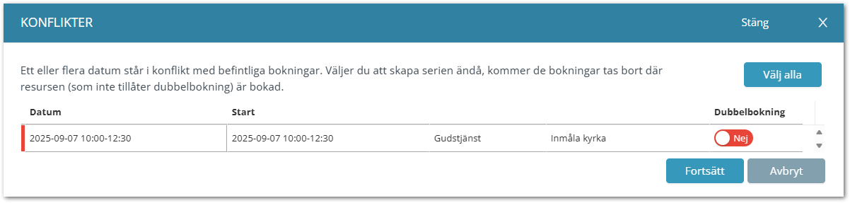 Om du ändå väljer att kopiera till alla valda datum så kommer du få upp följande ruta om konflikter.