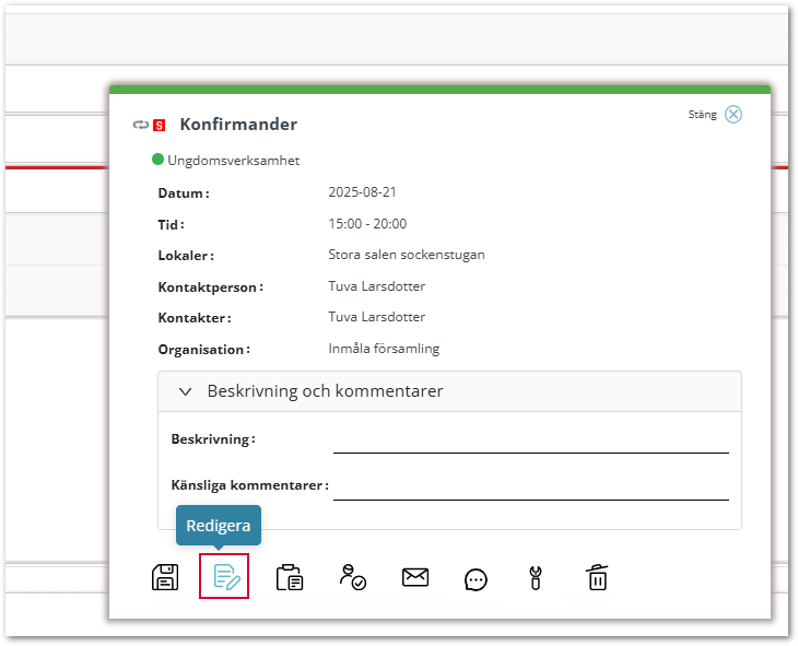 När du klickar på en bokning i kalendervyn, visas informationen om bokningen. Om du klickar på Redigera öppnas bokningen.