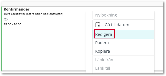 Ett tredje alternativ att öppna en bokning för redigering är att högerklicka på aktuell bokning och välja Redigera.