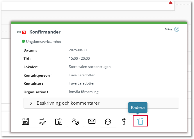 När du markerar en bokning i kalendervyn visas information om den i pop-up dialogen. För att radera bokningen klickar du på Soptunnan.