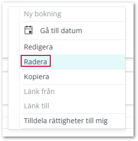 Du kan också radera bokningen genom att högerklicka på bokningen och välja Radera.