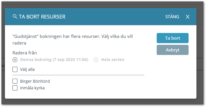 Om bokningen som ska raderas är knuten till flera resurser måste du ange vilka resurser som ska raderas. Ska hela bokningen, med samtliga resurser, raderas väljer du Välj alla. När du gjort dina val klickar du på Ta bort för att radera.