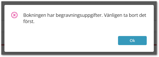 Om du raderar en bokning av Dop, Vigsel eller Begravning kan du få följande meddelande: