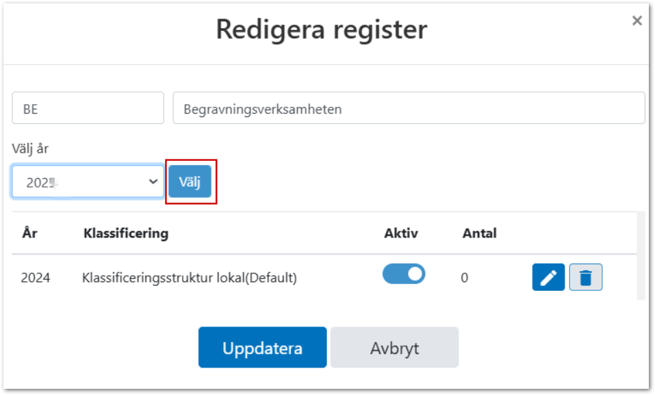 - I nästa steg väljs den Klassificering som önskas för det nya året. Klicka på knappen med bocken och därefter på Uppdatera.