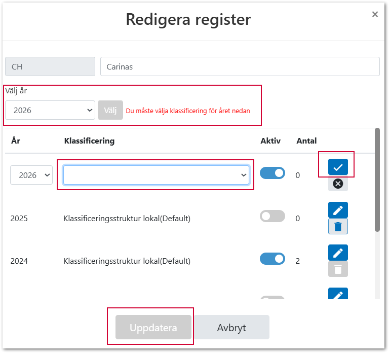- I nästa steg väljs den Klassificering som önskas för det nya året. Klicka på knappen med bocken och därefter på Uppdatera.