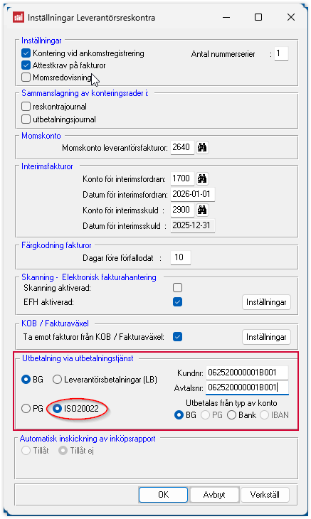 För att LabOra Ekonomi ska kunna skapa en utbetalningsfil i XML-format (ISO20022) behöver några uppgifter fyllas i för att aktivera ISO20022 för leverantörsreskontran. Bankuppgifter och systeminställningar uppdateras utifrån ert ISO-avtal med Swedbank.