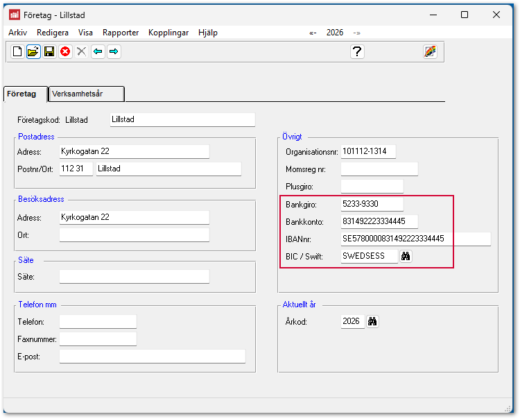 Börja med att ställa in bankuppgifterna för er organisation. Det görs under Grunddata > Företag > Företag.