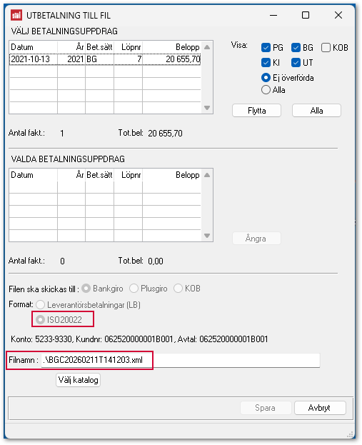 När en utbetalningsfil nu skapas är formatet inställt på ISO20022 och filnamnet slutar på .xml.