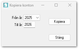 Här väljer du i fältet Från år: året du vill kopiera från. I fältet Till år: anger du det nya året som kontona ska kopieras till. klicka sedan på kopiera.