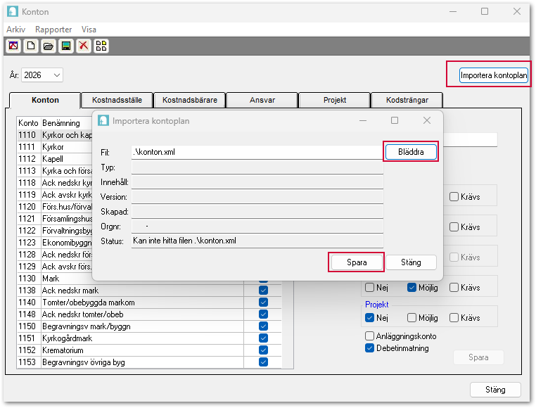 Öppna formuläret Konton via Grunddata>Konton>Konton klicka sedan på Importera kontoplan klicka på Bläddra och välj filen från utforskaren klicka sedan på Spara