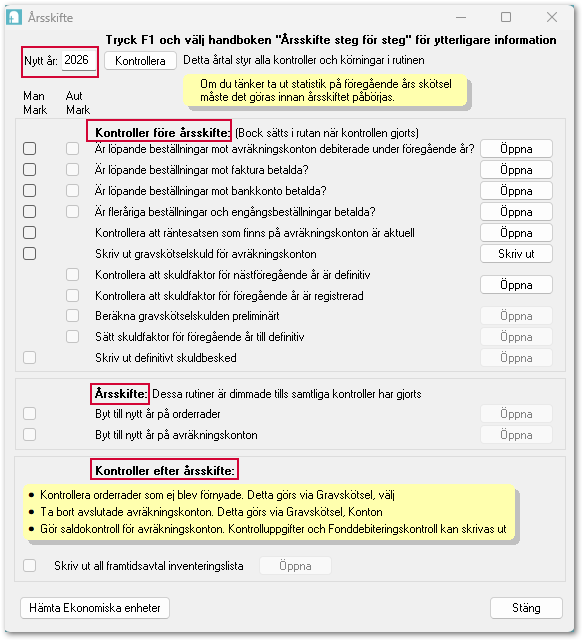 De fyra första raderna i Kontroller före årsskifte behandlar de olika beställningarna. Kontrollera att alla beställningar är betalda. Om det finns beställningar som av någon anledning inte är betalda måste dessa hanteras innan årsskiftet. Klicka i så fall på knappen Öppna. När allt är klart, sätt en markering i kryssrutan. Om ingen åtgärd behövs sätts en markering i kryssrutan till höger per automatik.