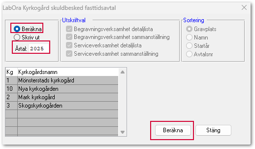 Nu kan gravskötselskulden för fasttidsavtal beräknas. Klicka på Öppna och Beräkna. En fellista genereras om det finns felaktigheter i något avtal, till exempel om ett avtal saknar avtalsnummer. Rätta eventuella fel och klicka på Beräkna igen.