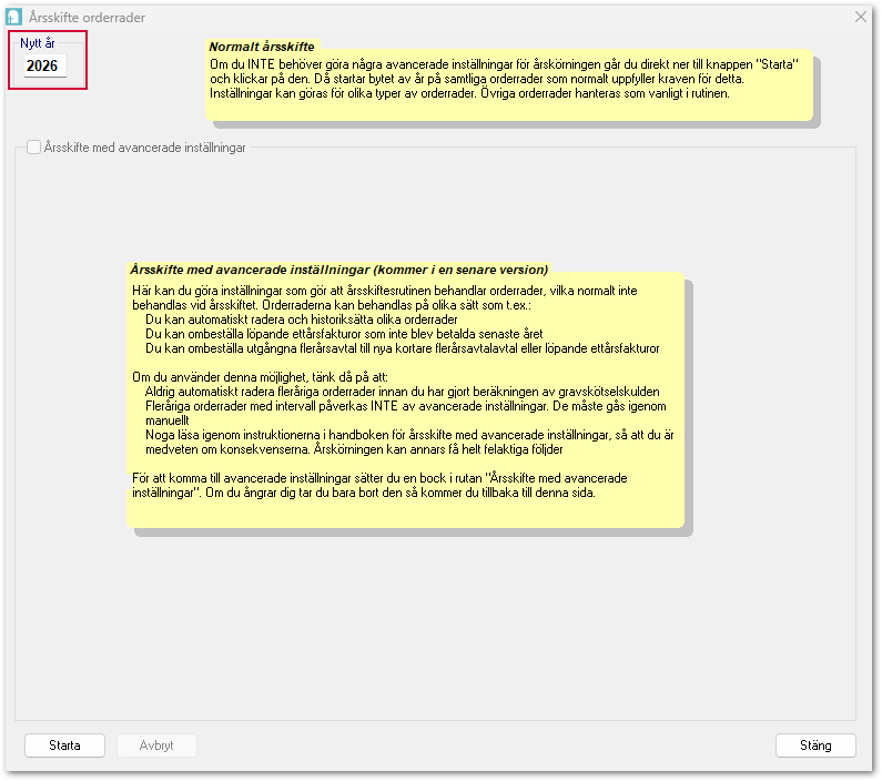 Kontrollera att det nya året står under Nytt år. Klicka sedan på Starta. Systemet ställer nu om alla orderrader som är korrekta till det nya aktuella året. En lista genereras automatiskt med information om vad som hänt på de olika orderraderna. Sätt sedan en bock i kryssrutan för Byt till nytt år på orderraderna.
