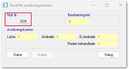 Byt nu år på avräkningskonton genom att klicka på Öppna. Kontrollera sedan att det nya året står i fältet för Nytt år och klicka på Starta. Avräkningskontona får nu ett nytt ingående saldo. En rapport genereras automatiskt med information om vad som hänt på kontona. Sätt sedan en bock i kryssrutan för Bytt till nytt år på avräkningskonton.