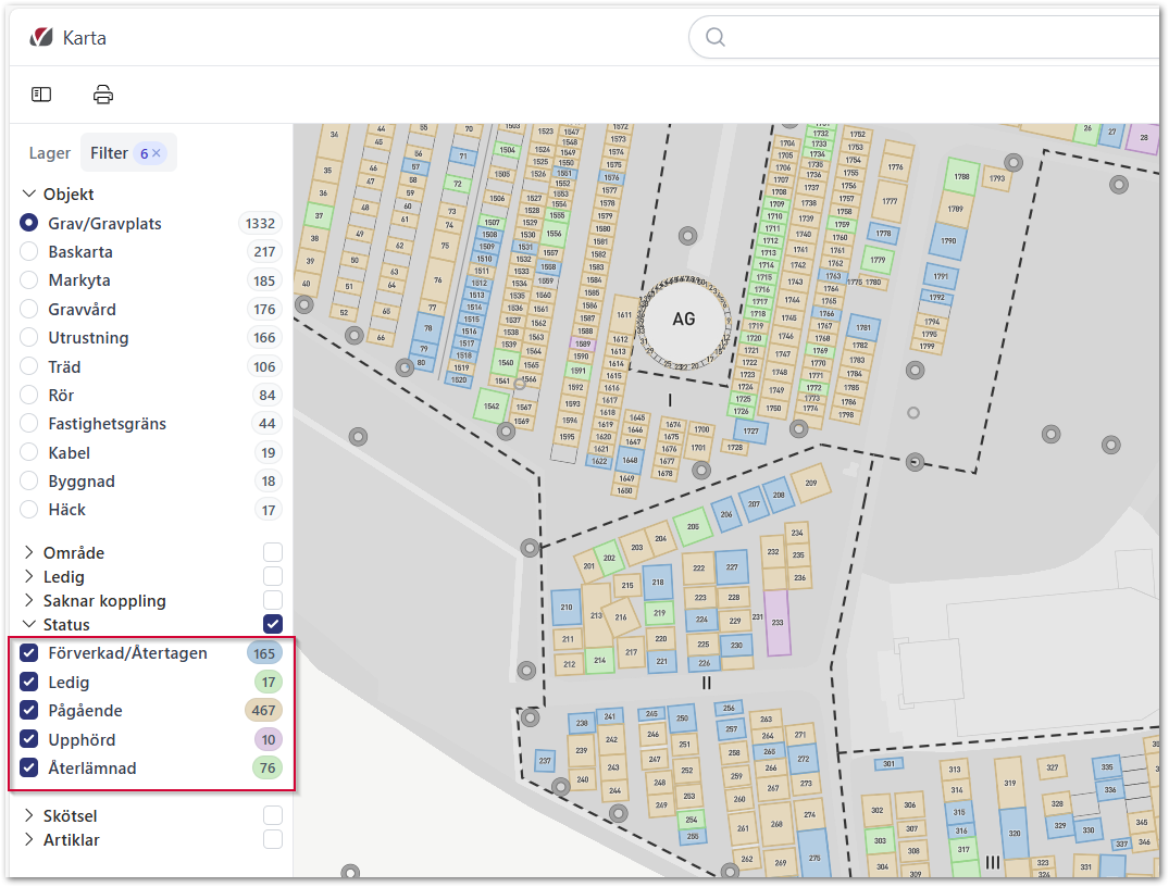 För er som har Admino karta kan information om antalet aktiva och inaktiva gravplatser för varje kyrkogård ses i kartans filter för Gravplatsstatus.