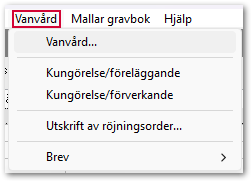 Beslut vanvård | Används när beslutet är taget på ett sammanträde. Ange med datum när beslutet togs. Det går då också att skriva ut en delgivning i form av brev som heter Föreläggande att sätta gravplatsen i stånd. Brevet skall skickas med mottagningsbevis. |