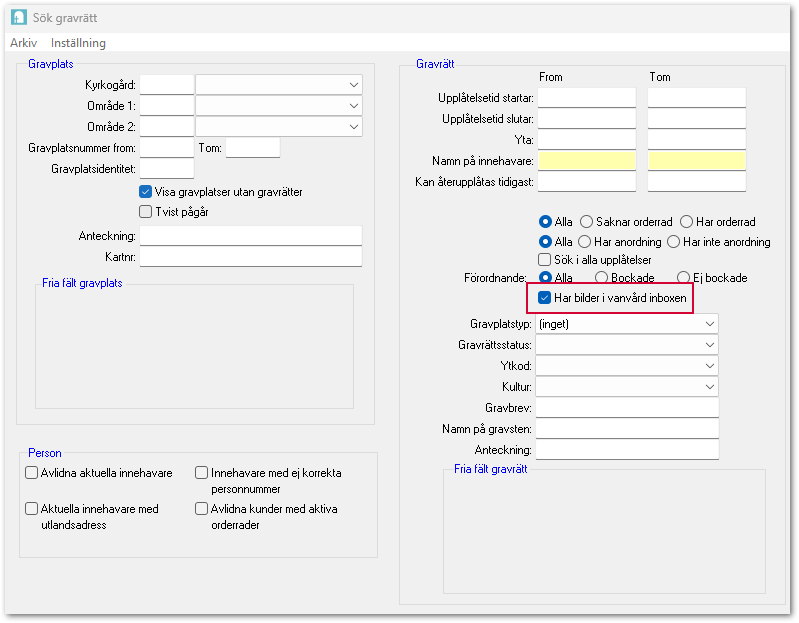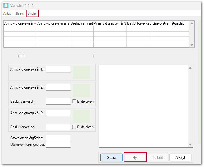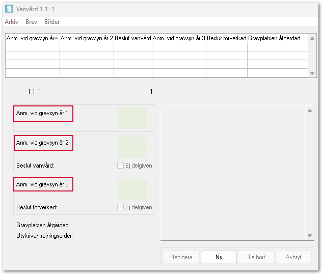 Anm vid gravsyn år 1 | Används för att notera de gravplatser som vid gravsyn upptäcks vara bristfälligt skötta. Ange med ett datum när gravsyn gjordes. När det är gjort så finns det möjlighet att skriva ett brev som heter Bristfällig skötsel, där det informeras om innehavarens skyldigheter och ev. erbjuds ett skötselavtal. |