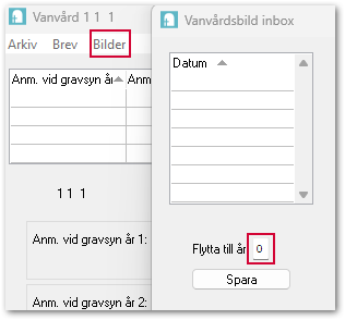 Det går också att gå via vanvårdsmodulen för att lägga till bilden på vanvårdsärendet. Klicka på Ny och klicka sedan på Bilder välj sedan bildfil och fyll i vilket år bilden ska tillhöra. Klicka på Spara när du är klar.