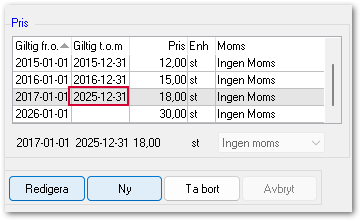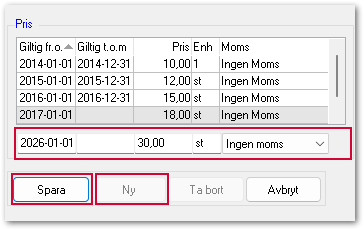 För att ändra pris markerar du den artikel som ska få nytt pris, klicka sedan på Ny i kolumnen för pris. Fyll i från vilket år priset ska gälla, datumet måste alltid vara 01-01. Fortsätt sedan fylla i uppgifter om pris och enhet. Klicka på Spara. Det gamla priset får nu automatiskt ett slutdatum per den sista innevarande år.