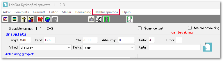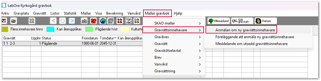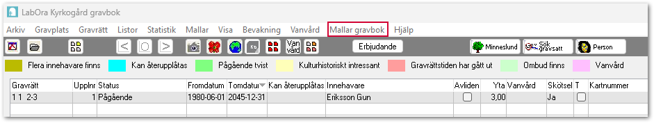 Eller så hittar du menyvalet Mallar gravbok i registerkortet för gravrätten.