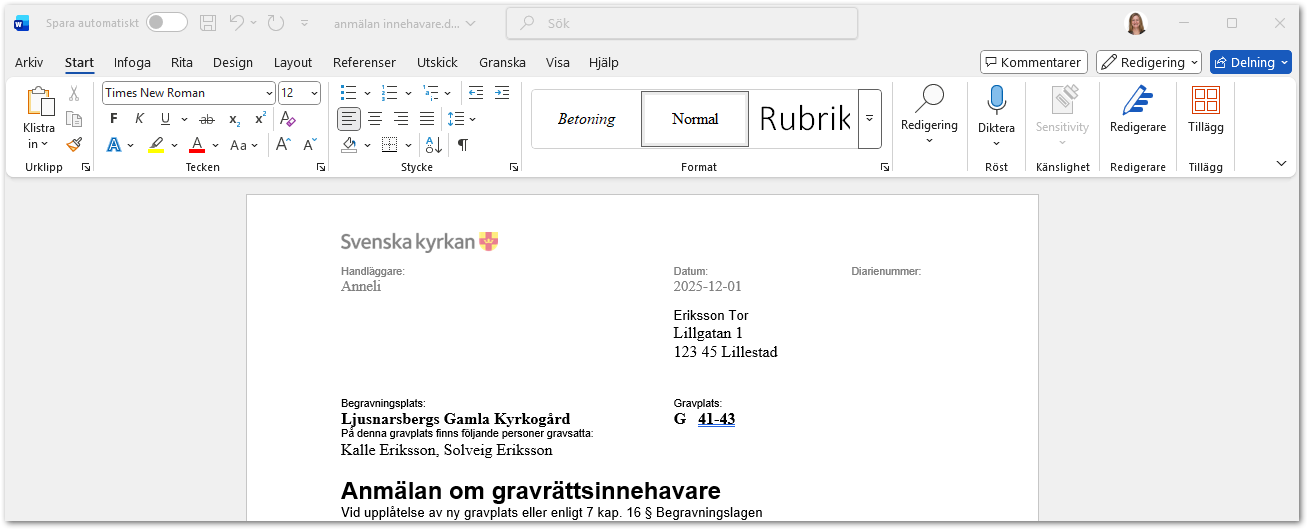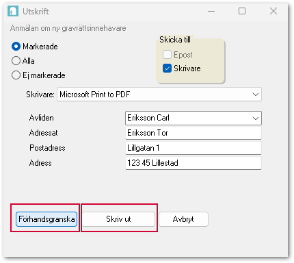 I några av mallarna behöver du fylla i kompletterande uppgifter innan de går att skriva ut. I exemplet har vi valt Anmälan om ny gravrättsinnehavare. Om du vill förhandsgranska brevet innan du skickar ut det väljer du Förhandsgranska annars klickar du på Skriv ut efter att du valt skrivare.
