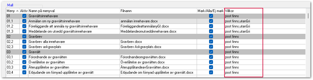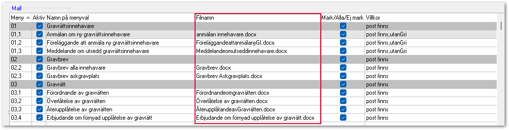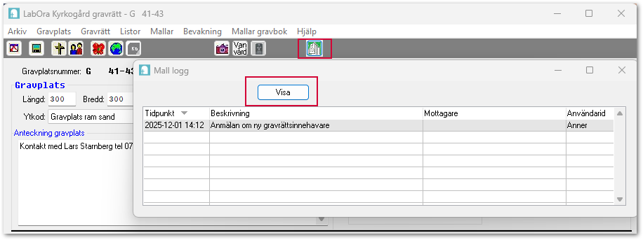 I den här mallrutinen ligger mallarna sparade i LabOra Kyrkogårds databas. Det gör att du enkelt kan spara den utskrivna mallen på registerkortet för gravrätten.