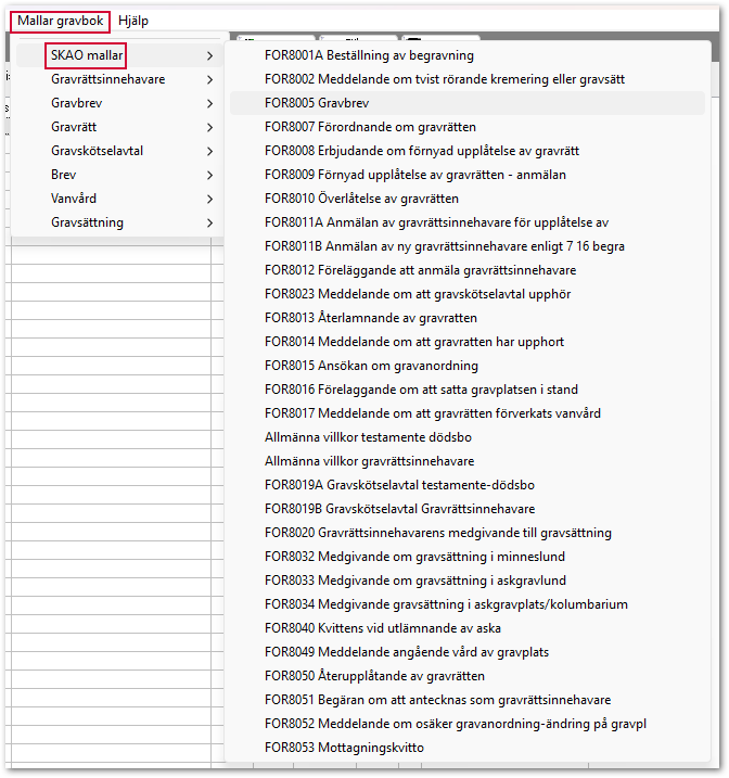 SKAOS mallar är tillgängliga i systemet. Mallarna är inte kopplade och ska helst inte redigeras, men det går att manuellt fylla i mallen med uppgifter från gravsystemet.