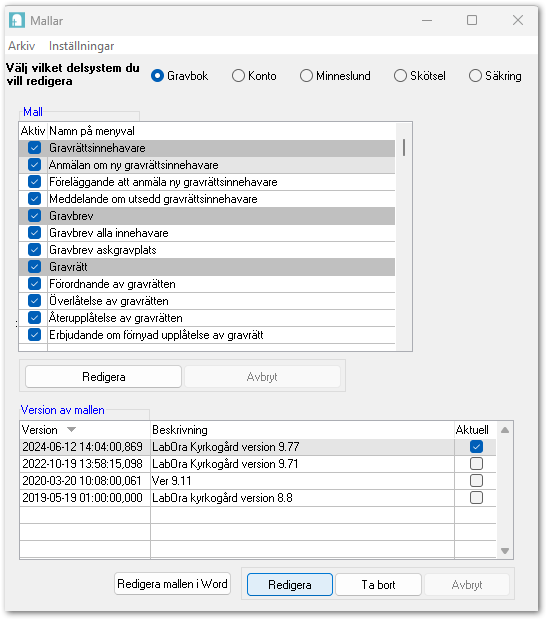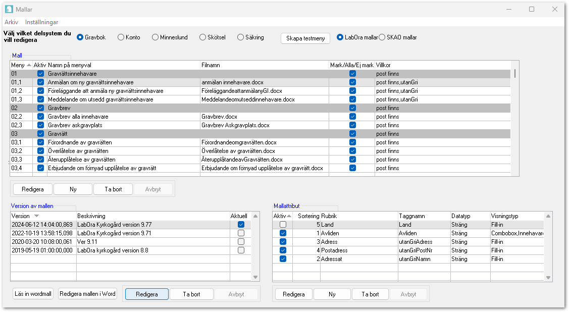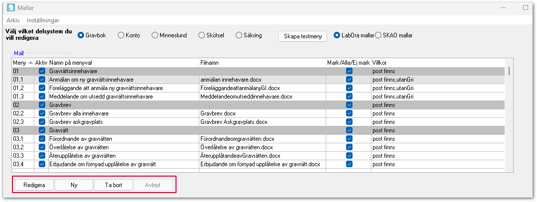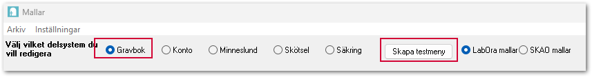 I den övre delen av fönstret finns de olika delsystemen: Gravbok, Konto, Skötsel och Säkring. Där väljer du även om det är LabOra mallar eller SKAO mallar som du vill redigera. Här väjer du först vilket delsystem du vill arbeta i sedan markerar du den mall du vill redigera. Finns mallen i flera delsystem behöver du redigera mallen där också. Du kan skapa en testmeny för att se hur menyerna visas.