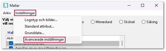 När du ska redigera i mallarna måste du först gå in under Inställningar > Avancerade inställningar.