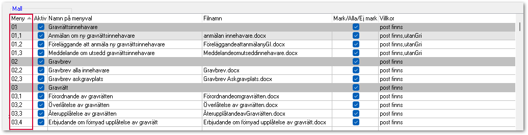 Siffrorna i den vänstra kolumnen Meny visar vilken ordning mallarna visas i menyn i Gravbok.