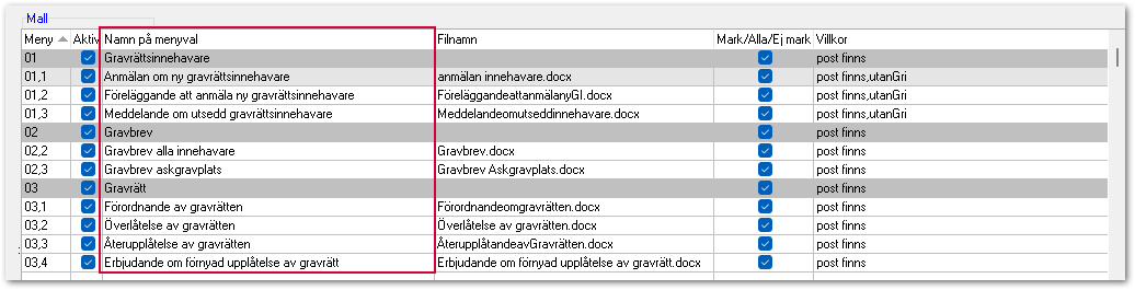 Namn på menyval är namnet som visas i menyn i Gravbok.