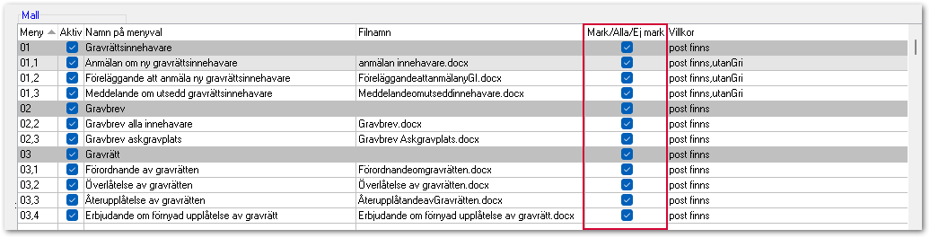 När vi i nya versioner uppdaterar mallarna är det också här du går in och markerar den nya versionen som aktiv. Anledningen till att du själv måste gå in och ”aktivera mallen” är att vi inte vill skriva över en mall ni eventuellt gjort ändringar i.