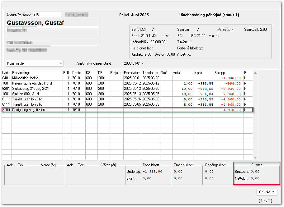 - För att få en nettolön till 0 kr i löneberedningen läggs löneart 9700 – Korrigering av negativ lön in. Ofta används kodsträng 1610 eller liknande på löneart 9700. När skulden regleras bokas den mot det konto ni använder. Det är den summan som den anställde ska betala tillbaka till er.