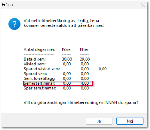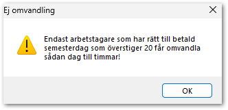 Observera att en dialogruta kommer att dyka upp när du skriver in l-art 5051. Texten informerar om att det endast är innevarande dagar som överstiger 20 som får lov att omvandlas. Maximalt 8 timmar får sparas till senare semesterår.