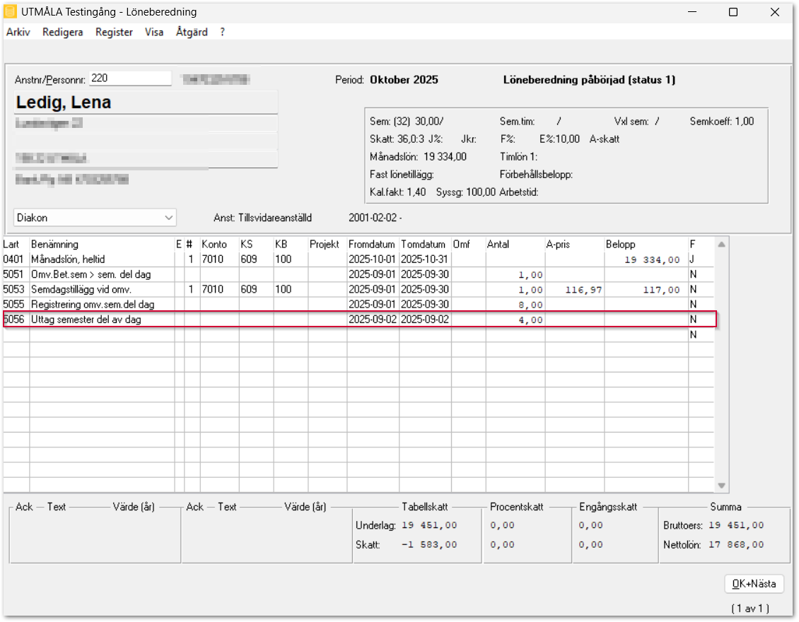 - De kvarvarande timmarna ligger kvar tills du använder de nästa gång och tas då ut med löneart 5056. När du klickar på OK nästa visas personens semestersaldon, vilket möjliggör kontroll av att timmarna registrerade korrekt.