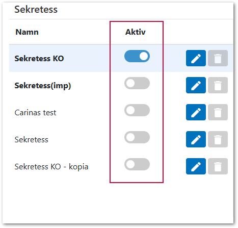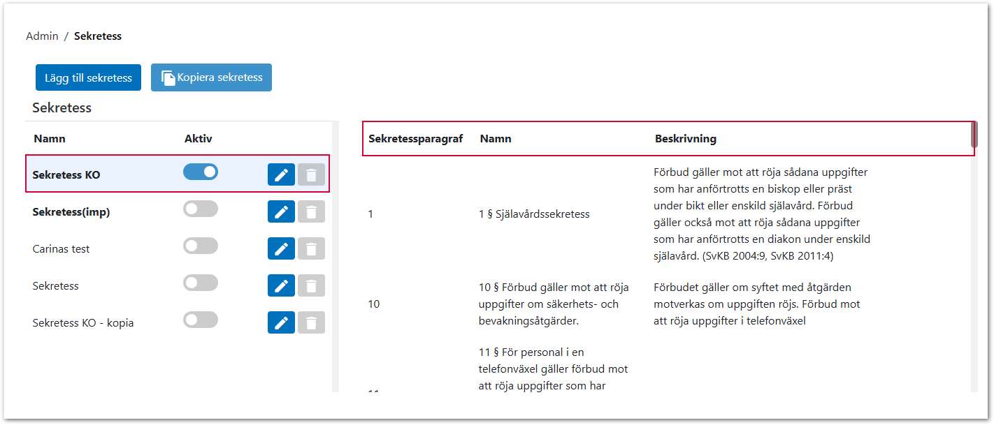 - Markera en sekretesslista för att få information om de paragrafer som är inlagda. Du kan redigera och ta bort en lista genom att använda knapparna Pennan eller Papperskorgen.