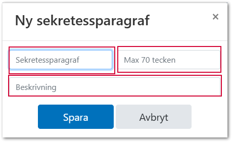 - Lägg därefter upp nya paragrafer med knappen Lägg till sekretessparagraf. Fyll i ett nummer för paragrafen i fältet Sekretessparagraf lägg sedan till en rubrik i nästa fält samt en beskrivning av paragrafen i fältet för Beskrivning. Klicka sedan på Spara.